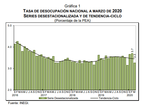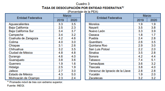 - La tasa de desocupación en Aguascalientes aumentó a 3.5% en marzo del 2020, en relación con el 3.3% de marzo del 2019