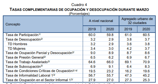 Tasa de Condiciones Críticas de Ocupación. Éste es un indicador de condiciones inadecuadas de empleo desde el punto de vista del tiempo de trabajo, los ingresos o una combinación insatisfactoria de ambos y resulta particularmente sensible en las áreas rurales del país. Incluye a las personas que se encuentran trabajando menos de 35 horas a la semana por razones ajenas a sus decisiones, más las que trabajan más de 35 horas semanales con ingresos mensuales inferiores al salario mínimo y las que laboran más de 48 horas semanales ganando hasta dos salarios mínimos. El indicador se calcula como porcentaje de la población ocupada. La tasa se estableció en 23.2% en el mes de referencia.