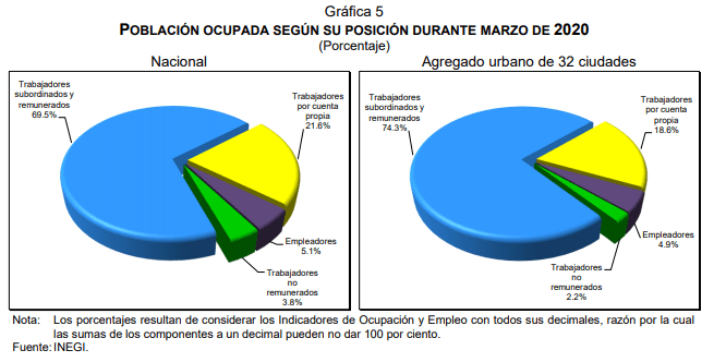 La población ocupada alcanzó 97.1% de la PEA durante marzo de 2020. Del total de ocupados, el 69.5% opera como trabajador subordinado y remunerado ocupando una plaza o puesto de trabajo, 21.6% trabaja de manera independiente o por su cuenta sin contratar empleados, 5.1% son patrones o empleadores, y finalmente un 3.8% se desempeña en los negocios o en las parcelas familiares, contribuyendo de manera directa a los procesos productivos pero sin un acuerdo de remuneración monetaria. En el ámbito urbano de alta densidad de población, conformado por 32 ciudades de más de 100 mil habitantes, el trabajo subordinado y remunerado representó 74.3% de la ocupación total, es decir 4.8 puntos porcentuales más que en el ámbito nacional.