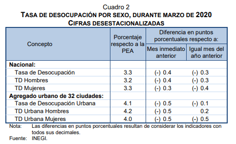 En el ámbito nacional, la tasa de desocupación (TD) se ubicó en 2.9% de la PEA en el tercer mes de 2020, porcentaje inferior al del mismo mes de un año antes, de 3.2 por ciento.