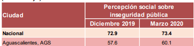 La percepción social sobre inseguridad pública por ciudad de interés aumentó 2.5%, es decir, en diciembre de 2019, 57.6%, y en marzo de 2020, 60.1% en el estado