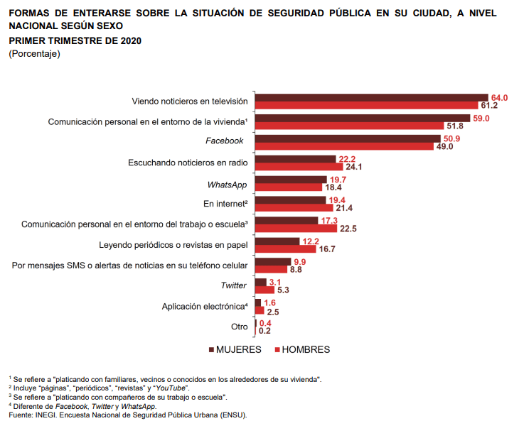 62.7% de la población de 18 años y más consulta los “noticieros en televisión” para informarse sobre la seguridad pública, el narcotráfico y la violencia; 55.7% mantiene “comunicación personal en el entorno de la vivienda1 ” para dicho propósito; mientras que 50% se informa por medio de Facebook, y 23.1% a través de “noticieros en radio”.