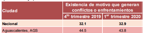 Población de 18 años y más según la existencia de motivos que generan conflictos o enfrentamientos, por ciudad de interés cuarto trimestre 2019 y primer trimestre 2020