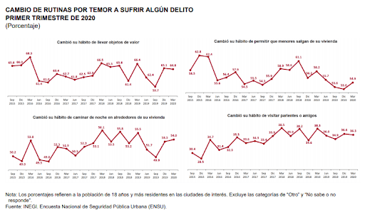 En relación con el primer trimestre de 2019, se presentó una disminución de 3.8 puntos porcentuales en cuanto a la atestiguación de vandalismo; 3.7 puntos porcentuales respecto a bandas violentas o pandillerismo; 3.6 puntos porcentuales respecto a la atestiguación en los alrededores de su vivienda de robos o asaltos; y 1.7 puntos porcentuales en cuanto a disparos frecuentes. Con respecto del cuarto trimestre de 2019 se presentó una disminución de 1.3 puntos porcentuales en la atestiguación de consumo de alcohol en las calles; y de 1.4 en puntos porcentuales en cuanto a disparos frecuentes en los alrededores de su vivienda.