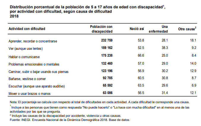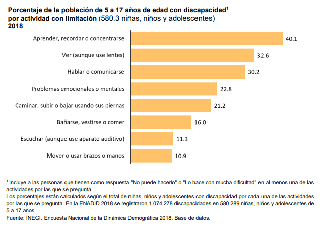 En México residen 29.3 millones de niñas, niños y adolescentes de 5 a 17 años, que representan 23.4% del total de la población del país y de las cuales 2.0% (580 289 personas) son considerados población con discapacidad. Información de la Enadid 2018 muestra que actividades como aprender, recordar o concentrarse (40.1%) (232.8 mil), ver (aunque use lentes) (32.6%) (189.2 mil) y hablar o comunicarse (30.2%) (175.2 mil) son las actividades con mayor proporción de niños, niñas y adolescentes con discapacidad, mientras que escuchar (aunque use aparato auditivo) (11.3%) (65.6 mil) y actividades motrices como mover o usar brazos o manos (10.9%) (63.1 mil) son las actividades menos declaradas.