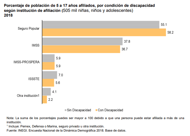 Cuando se analiza el tipo de institución donde niñas, niños y adolescentes con discapacidad pueden ejercer su derecho a la atención de su salud, en 2018, de un total de 505 mil, 58.2% pertenecían a un programa social con acceso a atención médica 36.7% al IMSS; 5.9% al IMSS-Prospera; 5.6% al Issste y 2.2% a otra institución o un seguro privado.