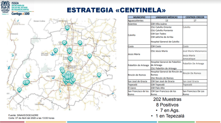 Detalló que en los 24 puntos que se han instalado como parte de dicha estrategia, se aplicaron hasta el momento 202 pruebas, identificándose ocho casos positivos de Covid-19, siete de ellos en la capital y uno más en el municipio de Tepezalá.
