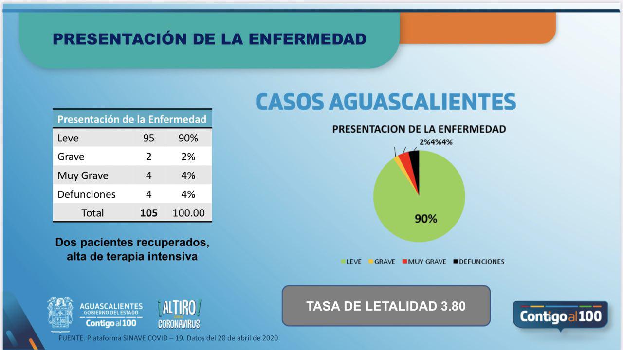En cuanto al número de pacientes que están en estos momentos en requieren de atención hospitalaria, se reportan solo 6 casos, lo que representa un 5.7% de los casos confirmados en Aguascalientes. En el caso de los pacientes recuperados, se suman a la lista 4 personas más que fueron dadas de alta, para dar un total de 44.