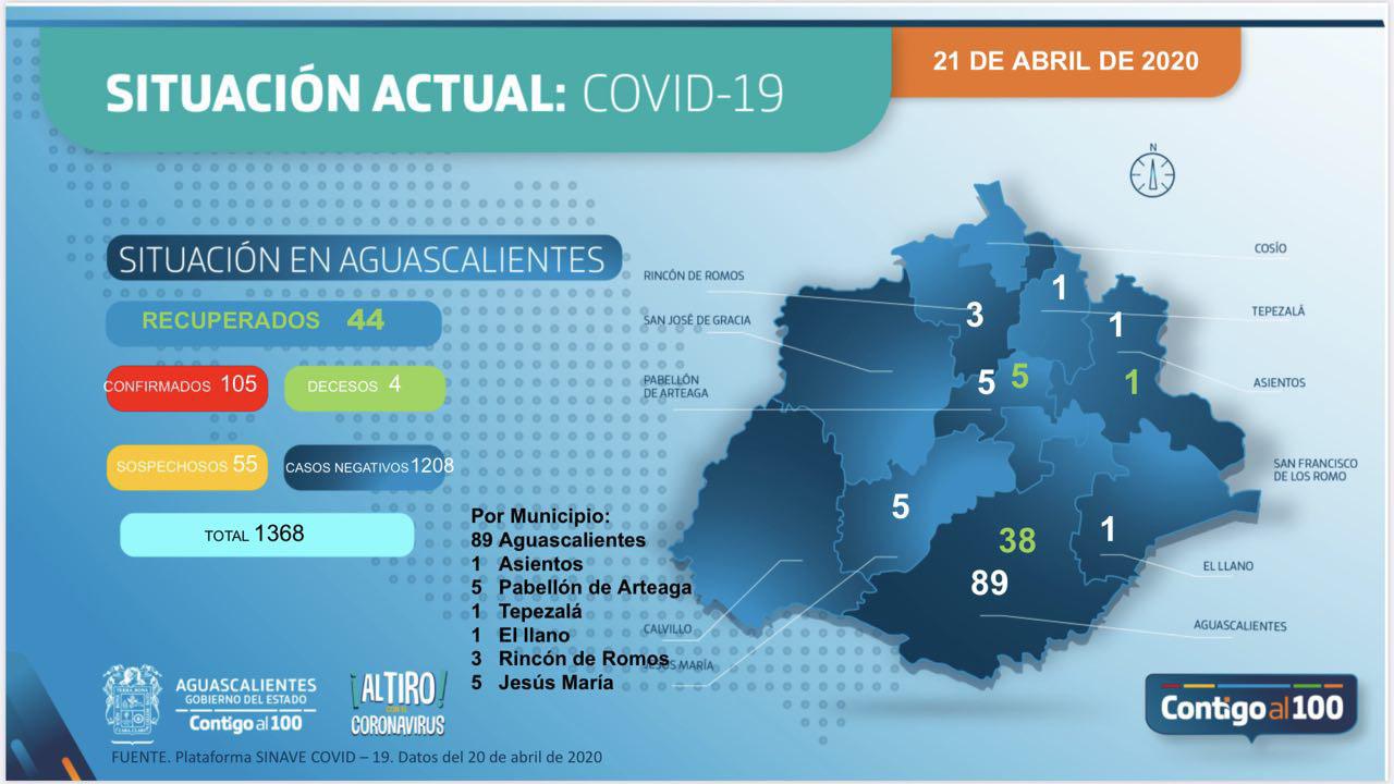 Con 10 nuevos casos confirmados de Covid-19, repunta el número de infectados en el estado, siendo hoy el día que más casos de contagios de han registrado desde la confirmación del primer paciente en Aguascalientes (15 de marzo, 2020). Son ya 105 enfermos de Covid-19 en la entidad, distribuidos en 7 de los 11 municipios.