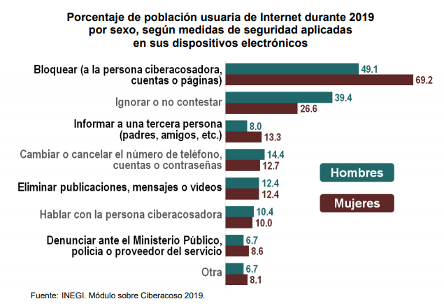 49.1% de los hombres y 69.2% de las mujeres de 12 años y más que utilizaron Internet en 2019 y fueron víctima de ciberacoso tomó la acción de bloquear personas, cuentas o páginas.