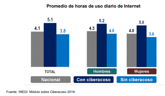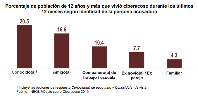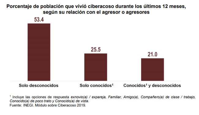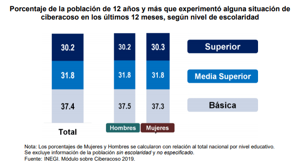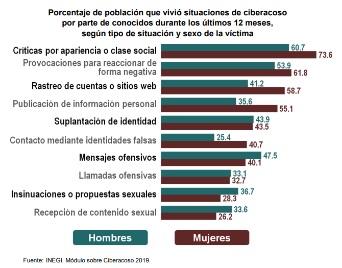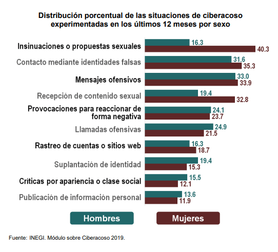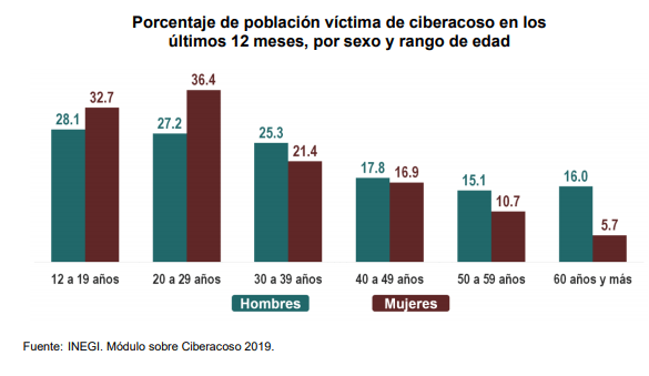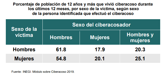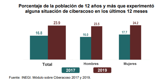 En México, la población de 12 y más años estimada por la Encuesta Nacional sobre Disponibilidad y Uso de las Tecnologías de la Información en los Hogares (ENDUTIH) 2019 es de 101.5 millones de personas. De ese total, 72.9% utilizó Internet en cualquier dispositivo en los últimos tres meses. De la población usuaria de Internet, 23.9% declaró haber vivido alguna situación de acoso cibernético,siendo ligeramente mayor para mujeres (24.2%) que para los hombres (23.5%), sin embargo, destaca que en el caso de las mujeres que ha vivido ciberacoso el acoso consistió en recibir insinuaciones o propuestas sexuales, contacto mediante identidades falsas y recibir mensajes ofensivos, mientras que los hombres reciben mensajes ofensivos en su mayoría, también contacto mediante identidades falsas y llamadas ofensivas. El estudio destaca que la población más expuesta al ciberacoso es de adolescentes y jóvenes, siendo las mujeres de nueva cuenta las que despuntan en agresiones.