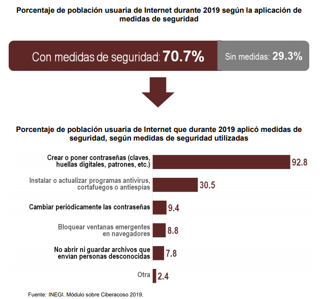 De los 74 millones de personas de 12 años y más que utilizaron Internet en cualquier dispositivo en los últimos tres meses, el 70.7% reportó que realiza alguna medida de seguridad para proteger su computadora, tableta electrónica, teléfono celular o cuentas de Internet. De ellos, 92.8% reportó como medida principal crear o poner contraseñas (claves, huella digital, patrón, etcétera); seguida de instalar o actualizar programas antivirus, cortafuegos o antiespías con 30.5 por ciento.