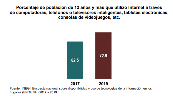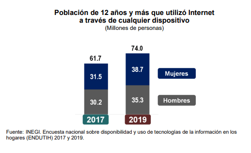 En México, el total de la población de 12 años y más estimada por la ENDUTIH es de 101.5 millones de personas, de las cuales 53.3% son mujeres y 46.7% hombres. De ese total, 72.9% utilizó Internet en cualquier dispositivo en los últimos tres meses, esto es, poco más de 74 millones de personas en el país, 38.7 millones de mujeres y 35.3 millones de hombres.