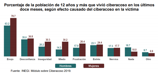 63.2% de los hombres y 78.7% de las mujeres de 12 años y más que utilizaron Internet en 2019 y fueron víctimas de ciberacoso experimentó enojo.