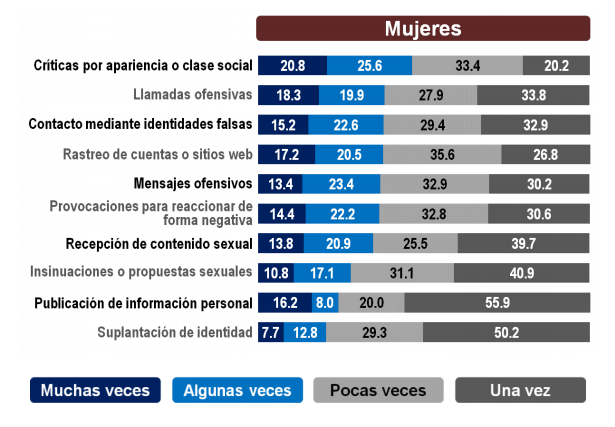 46.4% de las mujeres de 12 años y más que fueron víctima de ciberacoso durante los últimos 12 meses experimentó con mayor frecuencia críticas por su apariencia o su clase social. Por otro lado, 32.4% de los hombres experimentó con mayor frecuencia la recepción de contenido sexual.