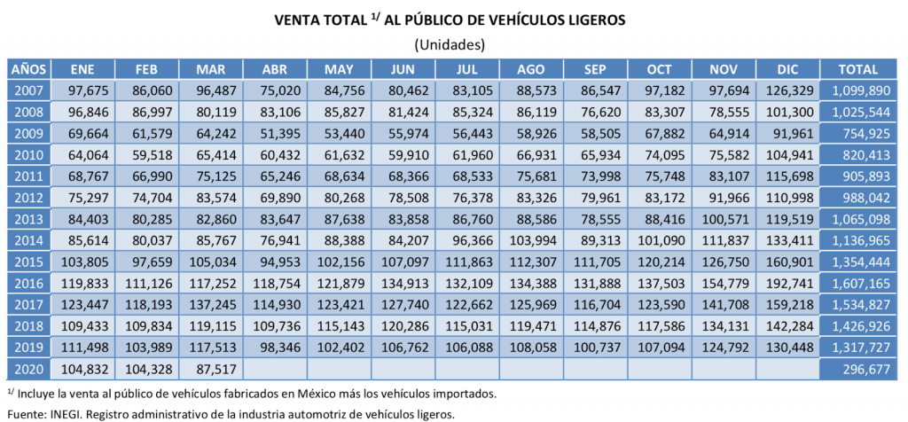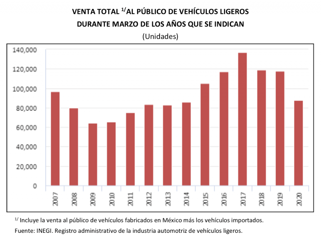 El Inegio dio a conocer el avance de las ventas al público en el mercado interno según los registros administrativos de la industria automotriz de vehículos ligeros para el mes de marzo del presente año. Estas cifras provienen de 21 empresas afiliadas a la Asociación Mexicana de la Industria Automotriz, A.C. (AMIA), Mitsubishi Motors y Giant Motors Latinoamérica.