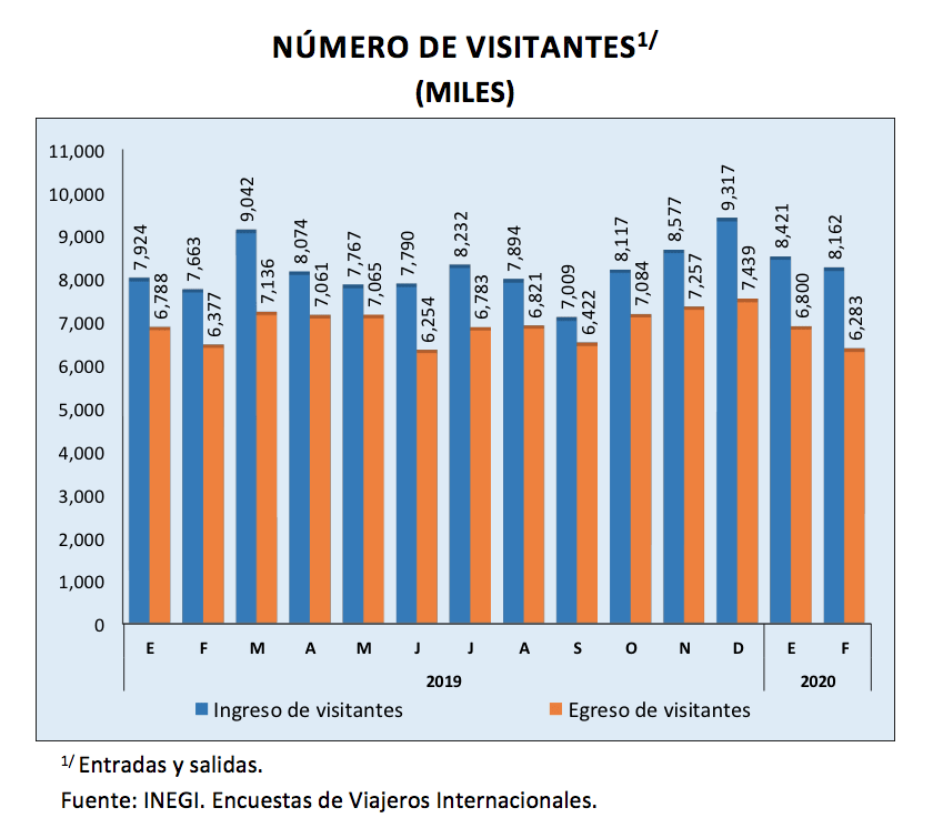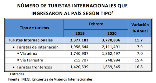 En su comparación anual, el número de turistas internacionales que ingresó al país registró un alza de 11.7% en el segundo mes de 2020 con relación a igual mes de 2019.