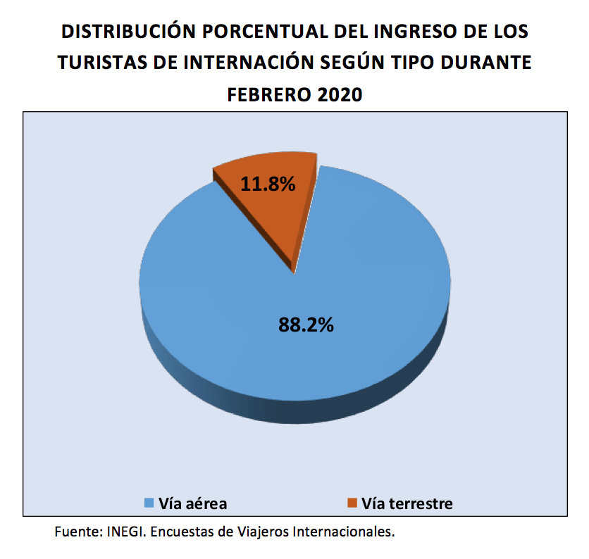 Del total de turistas de internación que ingresaron al país durante febrero de 2020, 88.2% correspondió a turistas por vía aérea y el restante 11.8% a turistas por vía terrestre.