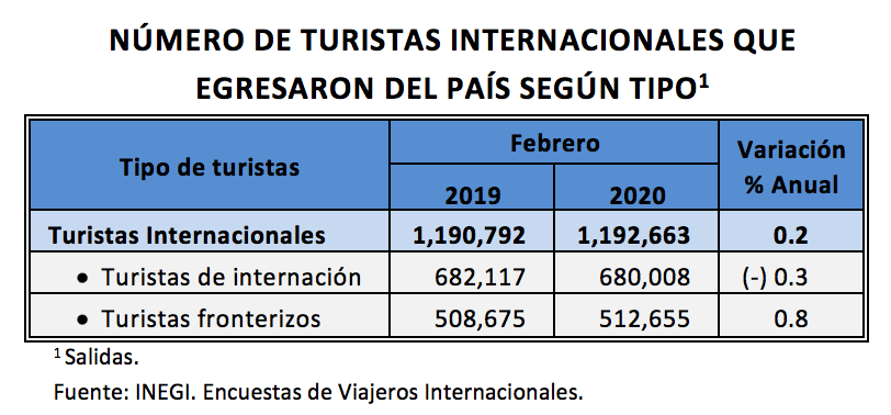 A tasa anual, el número de turistas internacionales que egresó del país en febrero pasado registró un aumento de 0.2% frente a igual mes de 2019.
