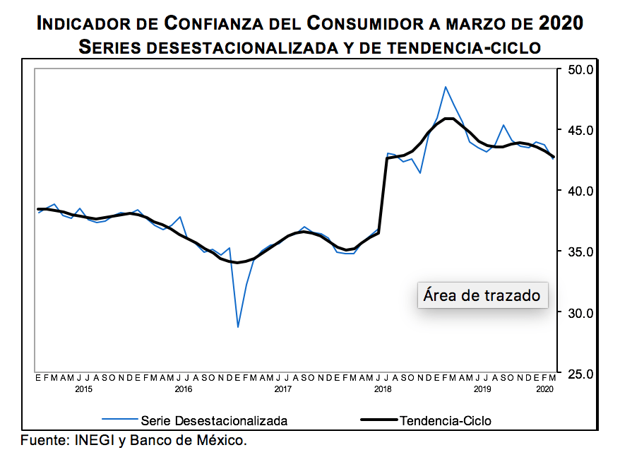 En marzo de 2020 el ICC se situó en 42.6 puntos con datos desestacionalizados, nivel que significó un descenso de (‑)1.2 puntos respecto a la cifra observada en el mes previo.