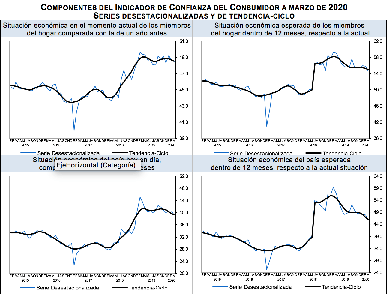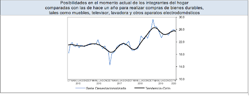 En términos desestacionalizados, en el tercer mes de 2020 el componente correspondiente a la opinión sobre la situación económica de los integrantes del hogar en el momento actual frente a la que tenían hace doce meses retrocedió (‑)0.1 puntos en su comparación mensual. El rubro que evalúa la expectativa sobre la situación económica de los miembros del hogar dentro de doce meses respecto a la que registran en el momento actual disminuyó (‑)1.1 puntos. La variable que mide la percepción de los consumidores acerca de la situación económica del país hoy en día comparada con la que prevaleció hace doce meses se redujo (‑)1.3 puntos. El indicador que capta las expectativas sobre la condición económica del país esperada dentro de un año respecto a la situación actual fue menor en (‑)2.1 puntos. El componente relativo a la opinión sobre las posibilidades en el momento actual por parte de los integrantes del hogar, comparadas con las de hace un año, para efectuar compras de bienes durables, tales como muebles, televisor, lavadora y otros aparatos electrodomésticos cayó (‑)0.5 puntos.