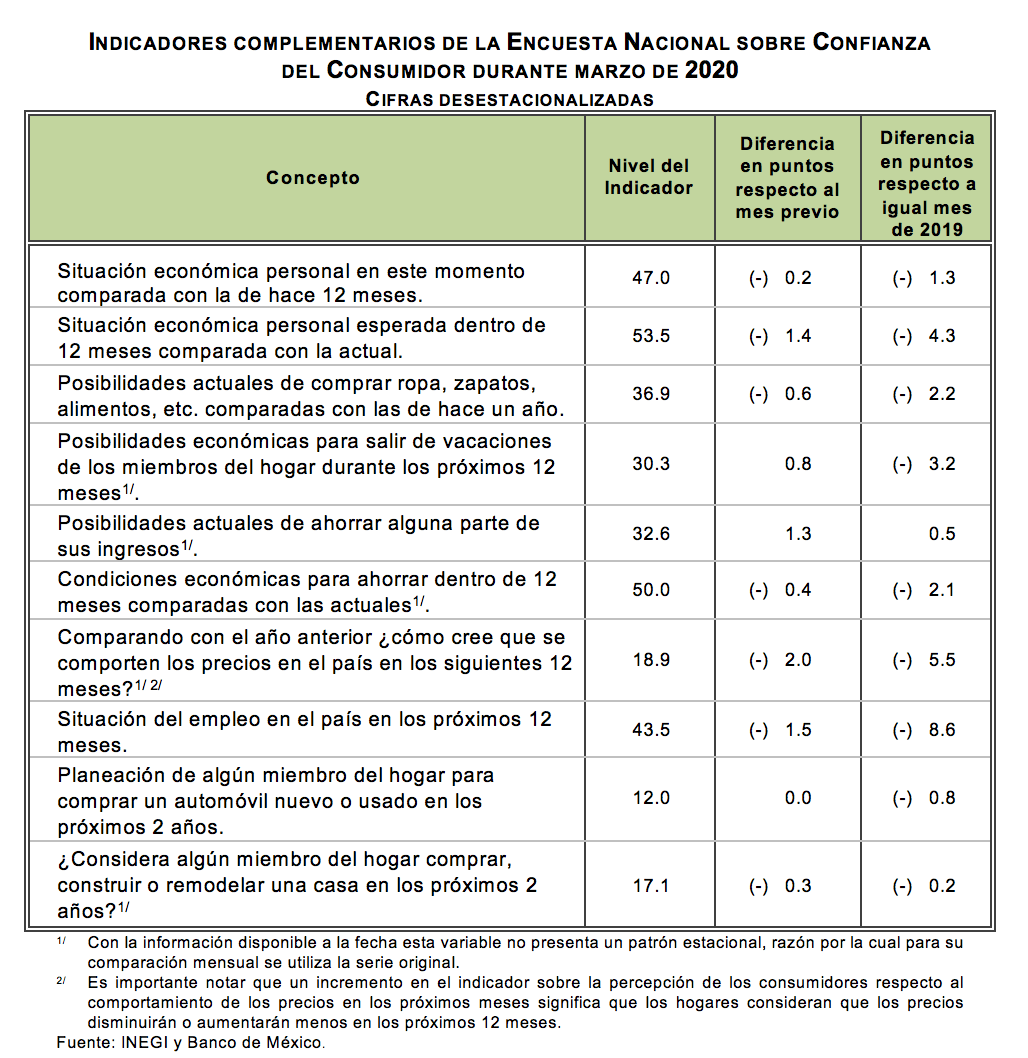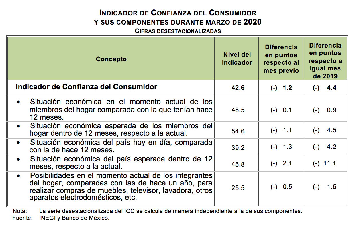 Con base en los resultados de la Encuesta Nacional sobre Confianza del Consumidor (ENCO) que recaban de manera conjunta el Instituto Nacional de Estadística y Geografía y el Banco de México en 32 ciudades del país, las cuales comprenden a la totalidad de las entidades federativas, se calcula el Indicador de Confianza del Consumidor (ICC). Este indicador resulta de promediar cinco indicadores parciales que recogen las percepciones sobre la situación económica actual del hogar de los entrevistados respecto a la de hace un año; la situación económica esperada del hogar dentro de doce meses; la situación económica presente del país respecto a la de hace un año; la situación económica del país dentro de doce meses; y qué tan propicio es el momento actual para la adquisición de bienes de consumo duradero.
