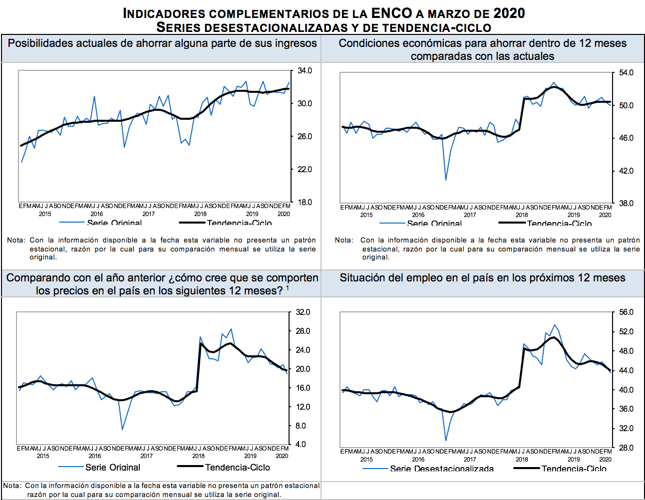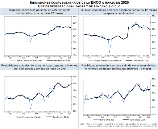 Con base en los resultados de la Encuesta Nacional sobre Confianza del Consumidor (ENCO) que recaban de manera conjunta el Instituto Nacional de Estadística y Geografía y el Banco de México en 32 ciudades del país, las cuales comprenden a la totalidad de las entidades federativas, se calcula el Indicador de Confianza del Consumidor (ICC). Este indicador resulta de promediar cinco indicadores parciales que recogen las percepciones sobre la situación económica actual del hogar de los entrevistados respecto a la de hace un año; la situación económica esperada del hogar dentro de doce meses; la situación económica presente del país respecto a la de hace un año; la situación económica del país dentro de doce meses; y qué tan propicio es el momento actual para la adquisición de bienes de consumo duradero.