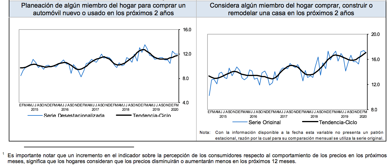 En términos desestacionalizados, en el tercer mes de 2020 el componente correspondiente a la opinión sobre la situación económica de los integrantes del hogar en el momento actual frente a la que tenían hace doce meses retrocedió (‑)0.1 puntos en su comparación mensual. El rubro que evalúa la expectativa sobre la situación económica de los miembros del hogar dentro de doce meses respecto a la que registran en el momento actual disminuyó (‑)1.1 puntos. La variable que mide la percepción de los consumidores acerca de la situación económica del país hoy en día comparada con la que prevaleció hace doce meses se redujo (‑)1.3 puntos. El indicador que capta las expectativas sobre la condición económica del país esperada dentro de un año respecto a la situación actual fue menor en (‑)2.1 puntos. El componente relativo a la opinión sobre las posibilidades en el momento actual por parte de los integrantes del hogar, comparadas con las de hace un año, para efectuar compras de bienes durables, tales como muebles, televisor, lavadora y otros aparatos electrodomésticos cayó (‑)0.5 puntos.