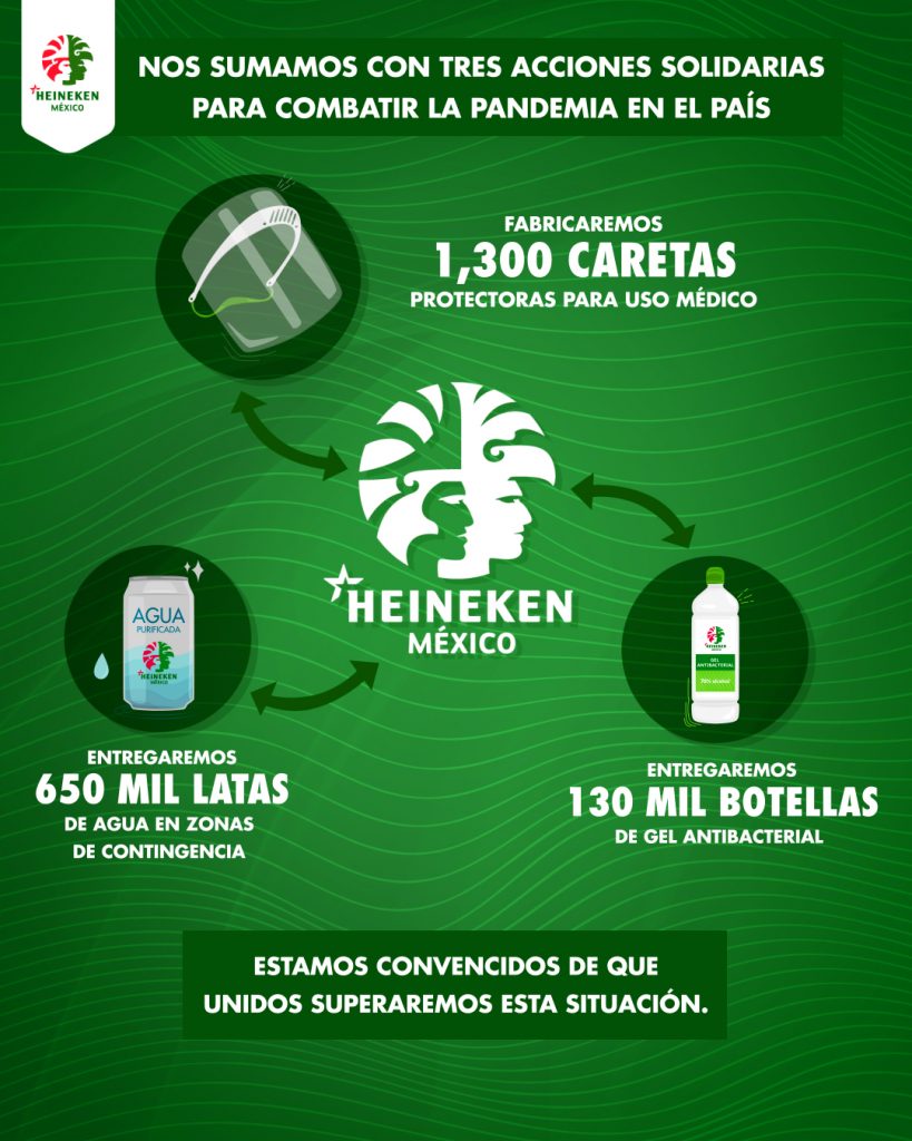 En respuesta a la emergencia derivada de la pandemia ocasionada por el Covid-19, y en apoyo a las acciones emprendidas por el Gobierno Federal y la sociedad civil para enfrentar esa situación, Heineken México da a conocer tres acciones solidarias en favor de los profesionales de la salud y la población en general, a partir de la reconversión de los recursos y las tecnologías que tiene a su disposición.