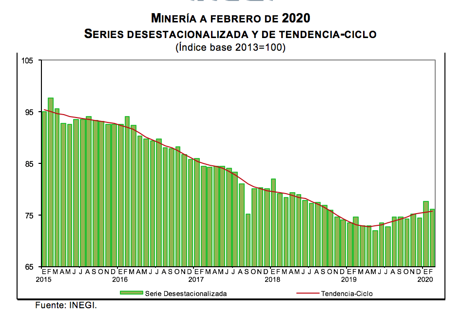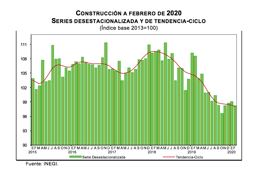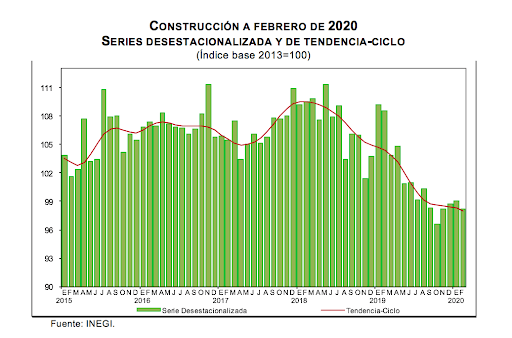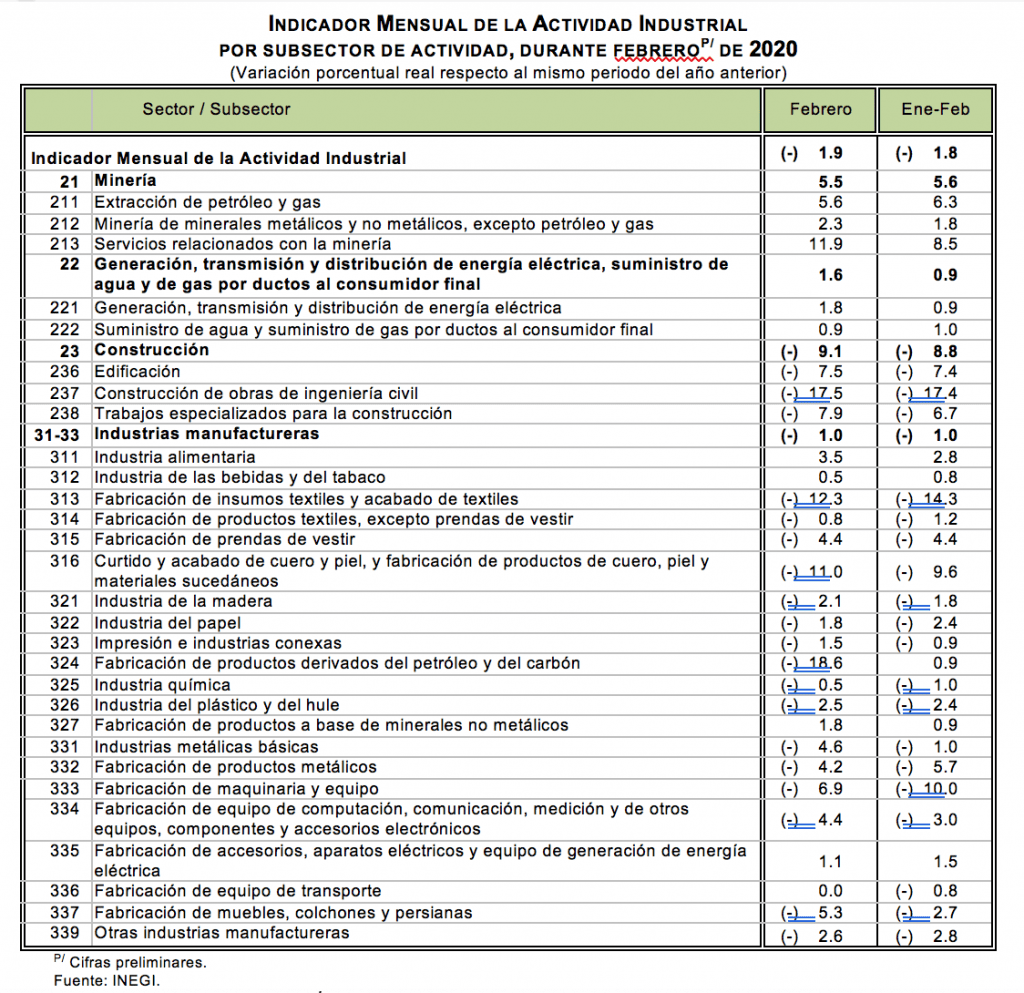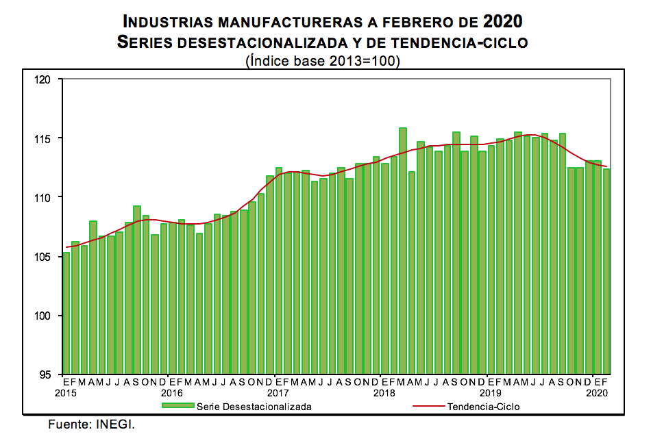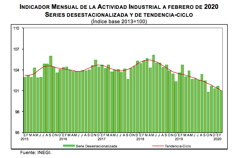 Con base en cifras desestacionalizadas, el Indicador Mensual de la Actividad Industrial (Minería; Generación, transmisión y distribución de energía eléctrica, suministro de agua y de gas por ductos al consumidor final; Construcción, y las Industrias manufactureras) se redujo (-)0.6% en términos reales durante febrero de 2020 respecto al mes previo.