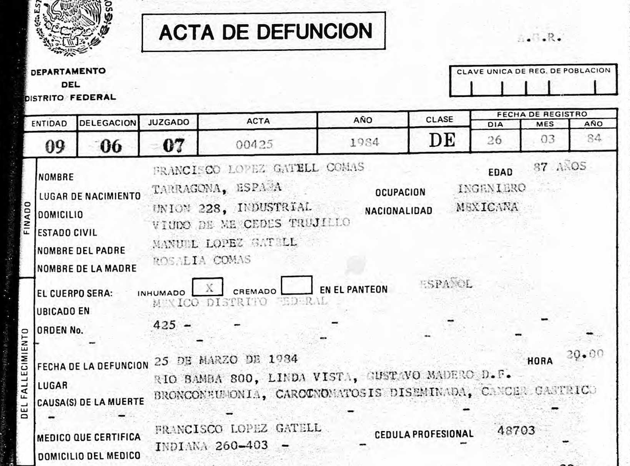 Él mismo lo revisó. “Es hora de dializarte, papá”, le dijo. Pero el catalán, que había sobrevivido a la guerra y que aún conservaba el anillo con un gato, se rehusó. Se fue a su casa en San Bartolo Ameyalco, cerca del Desierto de los Leones, y murió la tarde del 22 de junio de 1999. Ruy López Ridaura fue el médico que certificó el deceso.