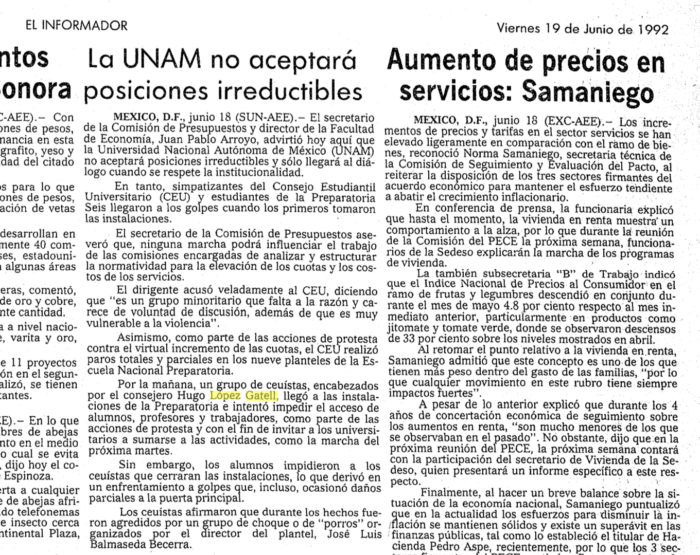 Un registro de presa del 19 de junio de 1992 lo menciona aún como consejero del CEU. “Un grupo de ceuístas, encabezados por el consejero Hugo López-Gatell, llegó a las instalaciones de la Preparatoria 6 e intentó impedir el acceso de alumnos, profesores y trabajadores, como parte de las acciones de protesta y con el fin de invitar a los universitarios a sumarse a las actividades”.