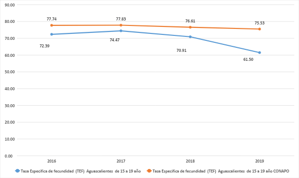 En Aguascalientes, de un estimado del Conapo por 75.53 nacimientos por cada mil adolescentes de 15 a 19 años, para la entidad; el SINAC 2019 nos reportó un total de 61.5 nacimientos por cada millar de adolescentes a diciembre del 2019, prácticamente 20% menos de lo esperado y 8 nacimientos menos que los registrados en promedio en el país, por cada mil adolescentes.