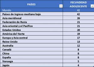 Países de ingreso bajo, en general ubicados en África, han tenido en promedio 98 nacimientos por cada mil adolescentes, prácticamente una de cada diez adolescentes, experimenta la fecundidad en forma temprana. En oposición a países como Corea del Sur en donde lo experimenta sólo una de cada mil. El promedio mundial se encuentra cercano a los 40 casos por millar, lo mismo que los países de renta media.