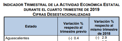 En el caso de Aguascalientes, la variación respecto al trimestre previo es de -0.4%; la variación respecto al mismo trimestre pero de 2018 es de -2.9%.
