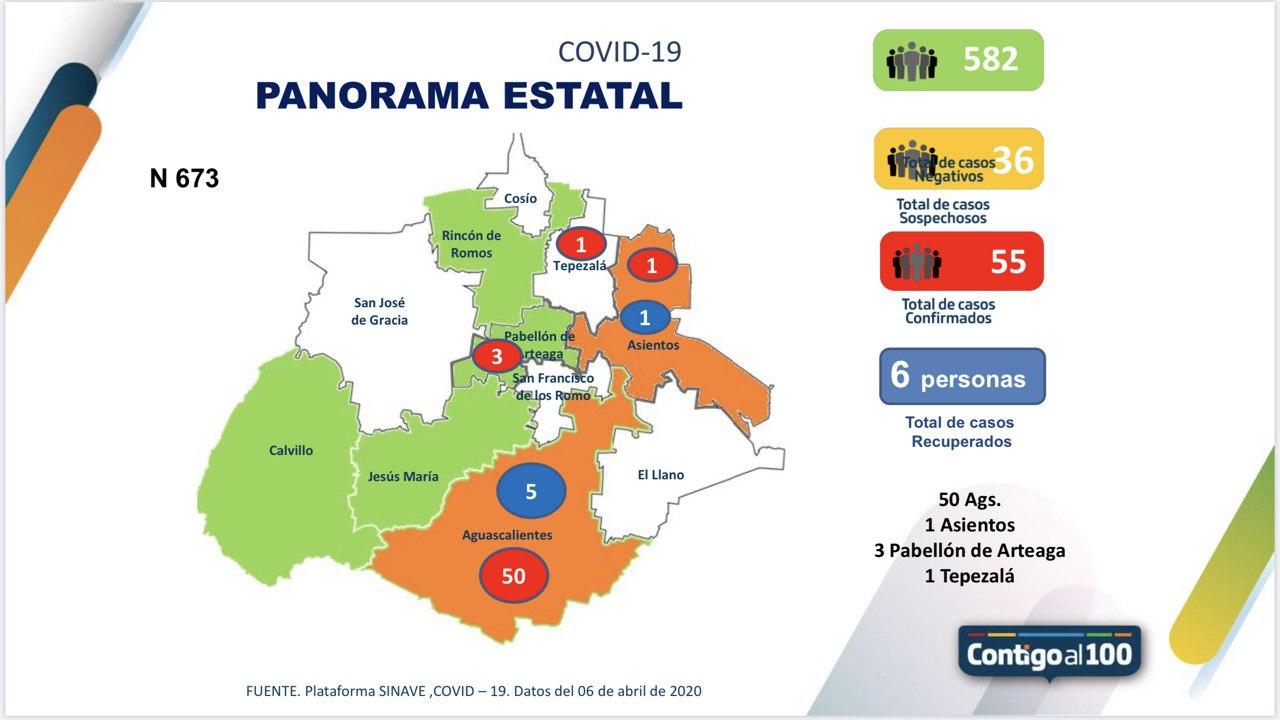 A la fecha, suman 55 los casos de Covid-19 en Aguascalientes distribuidos en cuatro de los once municipios del estado; la capital encabeza la lista con 50 casos confirmados, le sigue Pabellón de Arteaga de sigue con tres, Asientos con uno y se suma Tepezalá con un caso.