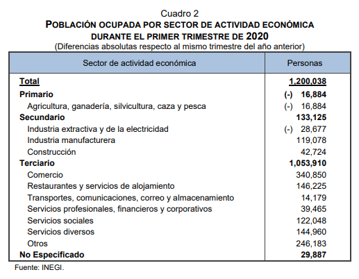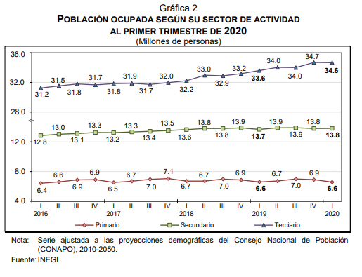 Al considerar a la población ocupada con relación al sector económico en el que labora, 6.6 millones de personas (11.9% del total) trabajan en el sector primario, 13.8 millones (24.9%) en el secundario o industrial y 34.6 millones (62.6%) están en el terciario o de los servicios. El restante 0.6% no especificó su actividad económica. Los montos correspondientes que se presentaron en el periodo enero-marzo de 2019 fueron de: 6.6, 13.7 y 33.6 millones de personas, en el mismo orden.
