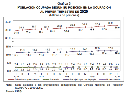 De las anteriores categorías se desprende que los trabajadores subordinados y remunerados se incrementaron en 1.1 millones de personas entre el primer trimestre de 2019 e igual periodo de 2020, los trabajadores por cuenta propia aumentaron en 164 mil personas y los empleadores en 137 mil personas, en tanto que los trabajadores no remunerados disminuyeron en (-)211 mil personas.