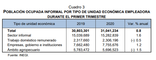 El empleo informal, o medición ampliada de informalidad, añade a la definición de trabajo informal las siguientes categorías: el trabajo no protegido en la actividad agropecuaria, el servicio doméstico remunerado de los hogares, así como los trabajadores subordinados que, aunque trabajan para unidades económicas formales, lo hacen bajo modalidades en las que se elude el registro ante la seguridad social. Así, la medición de la ocupación en el sector informal se considera el punto de partida y un componente del cálculo de una medida más amplia: el empleo informal. Los resultados de la ENOE indican que, en el primer trimestre del presente año todas las modalidades de empleo informal sumaron 31 millones de personas, es decir, éste aumentó en 0.8% respecto al mismo lapso de 2019 y representó 56.1% de la población ocupada (Tasa de Informalidad Laboral 1). De manera detallada, 15.3 millones conformaron específicamente la ocupación en el sector informal , cifra que significó un incremento de 1.6% a tasa anual y constituyó 27.6% de la población ocupada (Tasa de Ocupación en el Sector Informal 1); 7.8 millones corresponden al ámbito de las empresas, gobierno e instituciones; 5.7 millones al agropecuario y otros 2.3 millones al servicio doméstico remunerado.