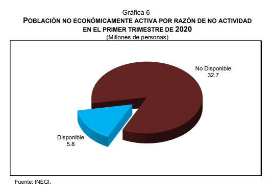 La población no económicamente activa (PNEA) agrupa a las personas que no participan en la actividad económica ni como ocupados ni como desocupados. En el primer trimestre del año en curso, 38.5 millones de personas, equivalentes al 40.1% del total de la población de 15 años y más, integraban este sector, del cual 32.7 millones declararon no estar disponibles para trabajar debido a que tenían que atender otras obligaciones, o tenían interés, pero se encontraban en un contexto que les impedía poder hacerlo (tiene impedimentos físicos, obligaciones familiares o están en otras condiciones). Por su parte, 5.8 millones se declararon disponibles para trabajar, pero no llevaron a cabo acciones al respecto, por lo que se constituyen en el sector que eventualmente puede contribuir en el mercado como desocupado u ocupado.
