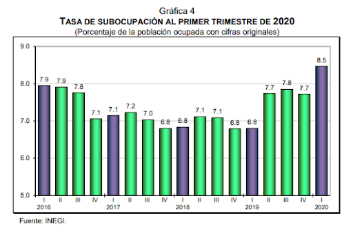 Al eliminar el factor estacional, la tasa de subocupación como proporción de la población ocupada se incrementó 0.8 puntos porcentuales en el primer trimestre de 2020 frente al trimestre inmediato anterior.