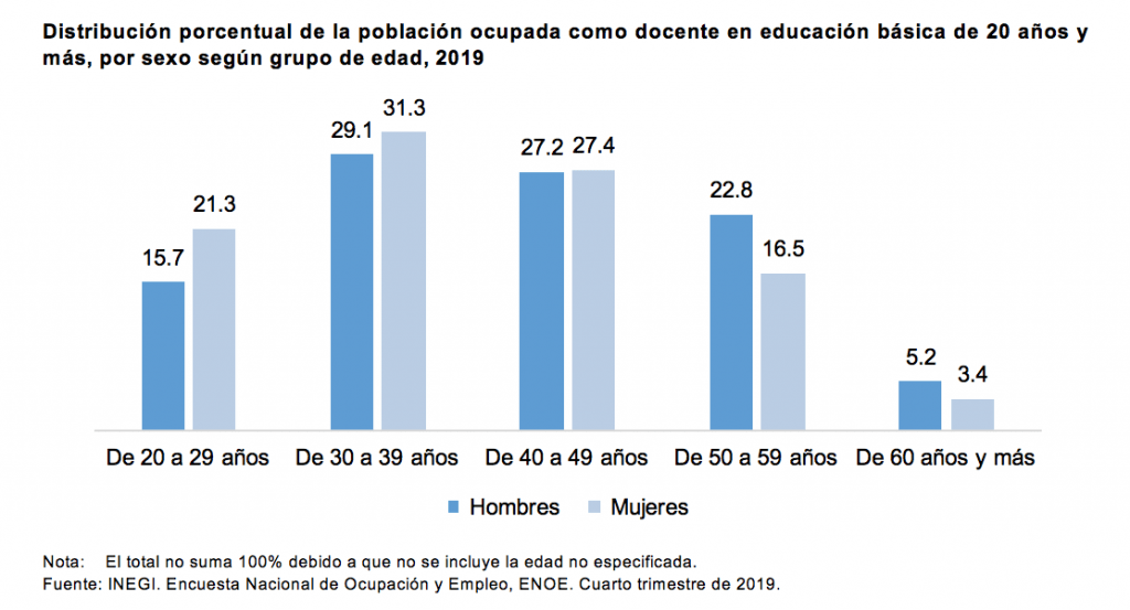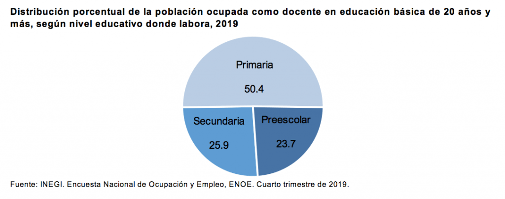 De acuerdo con los resultados de la ENOE, correspondiente al cuarto trimestre de 2019, hay en México 1 197 778 docentes ocupados en educación básica de 20 años y más de edad. De este total, prácticamente la mitad (50.4%) está impartiendo clase en primaria, 25.9% se desempeñan en secundaria y 23.7% en preescolar.