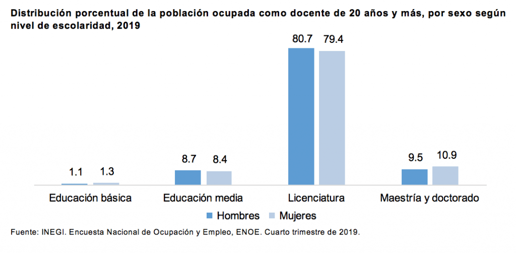 Los datos estadísticos respecto al nivel de escolaridad de la población docente que trabaja en educación básica destacan que aproximadamente 90% (que corresponde a 1 081 282 de ocupados) tiene estudios de educación superior (licenciatura, maestría o doctorado). Por sexo, no se observan variaciones significativas entre mujeres (90.2%) y hombres (90.3 por ciento).
