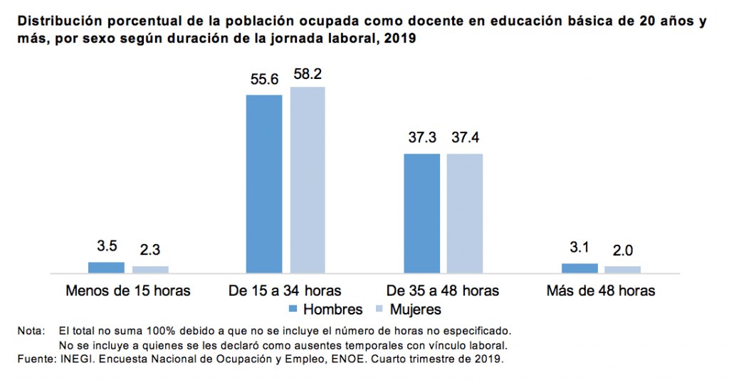 Más de la mitad de hombres y mujeres (55.6 y 58.2%, respectivamente) ocupados en la docencia trabajan entre 15 y 34 horas a la semana, mientras que 4 de cada 10 laboran más de 34 horas a la semana.