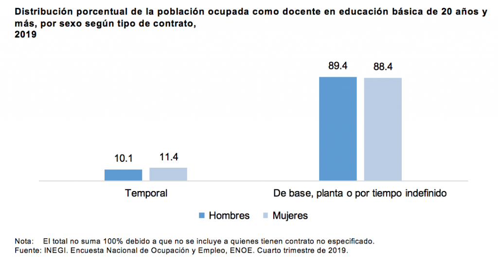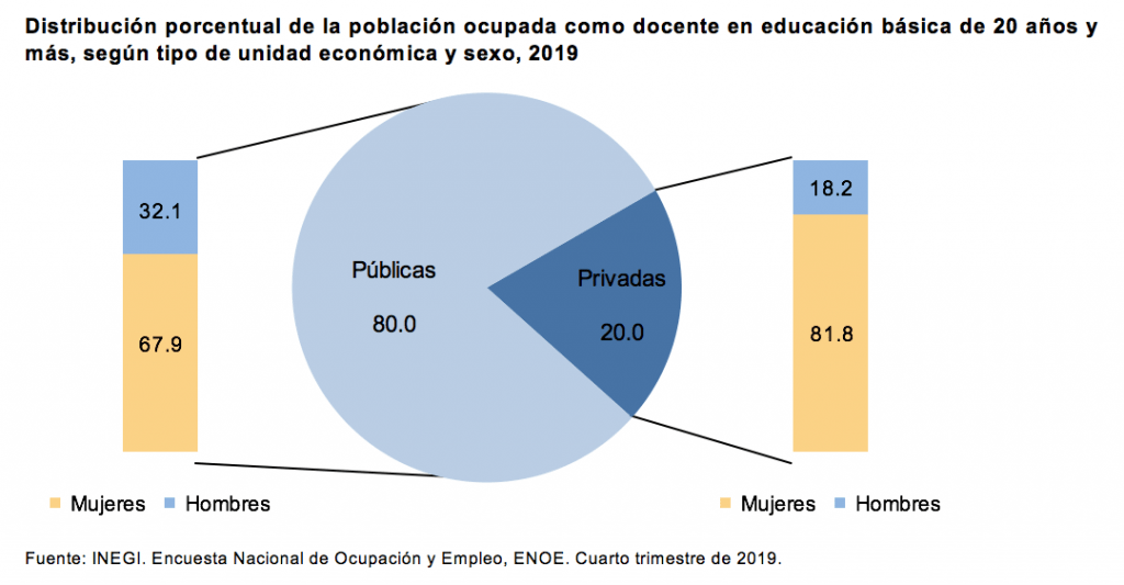 Según tipo de unidad económica, 80% de quienes se dedican a la docencia en educación básica se ubican en escuelas públicas; y de esta proporción, 67.9% son mujeres, mientras que en el sector privado la cifra de hombres es de 18.2 por ciento.