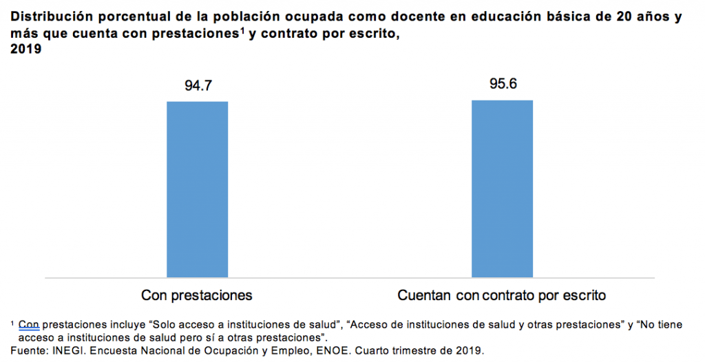 La mayor parte del personal docente es asalariado (98.7 por ciento). De este total, 95.6% cuenta con un contrato por escrito; mientras que, en lo referente a prestaciones, casi la misma proporción (94.7%) del personal docente dispone de ellas.