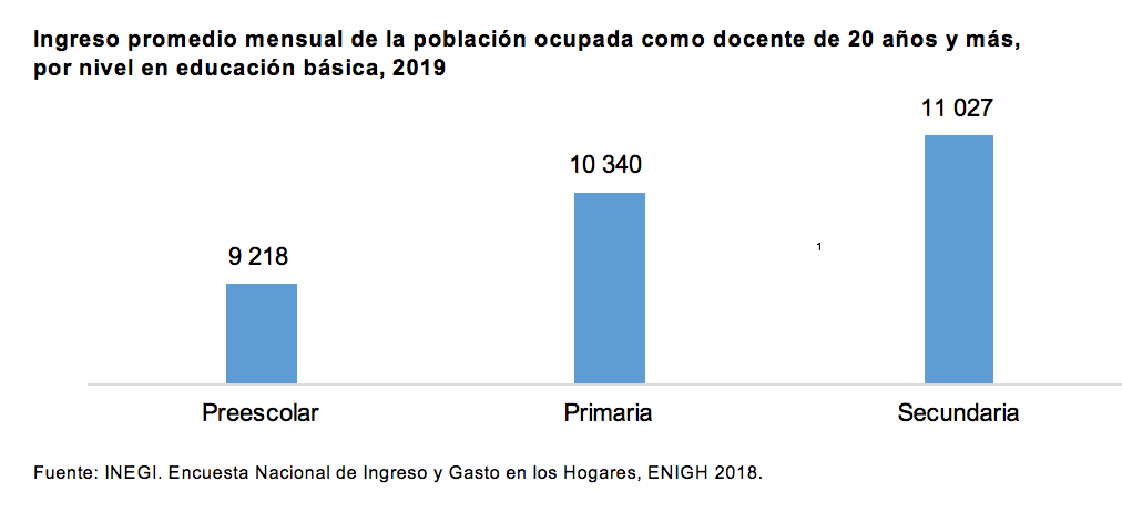 De acuerdo con los datos de la Encuesta Nacional de Ingresos y Gastos de los Hogares (ENIGH) de 2018, las personas ocupadas como docentes que se desempeñan en la enseñanza secundaria obtienen mayores ingresos mensuales, aproximadamente 11 mil pesos (11 027); le sigue la población docente en primaria, con poco más de 10 mil pesos (10 340) y, finalmente, están quienes ganan menos: las personas docentes de preescolar, que prácticamente ganan 9 mil pesos al mes (9 218).