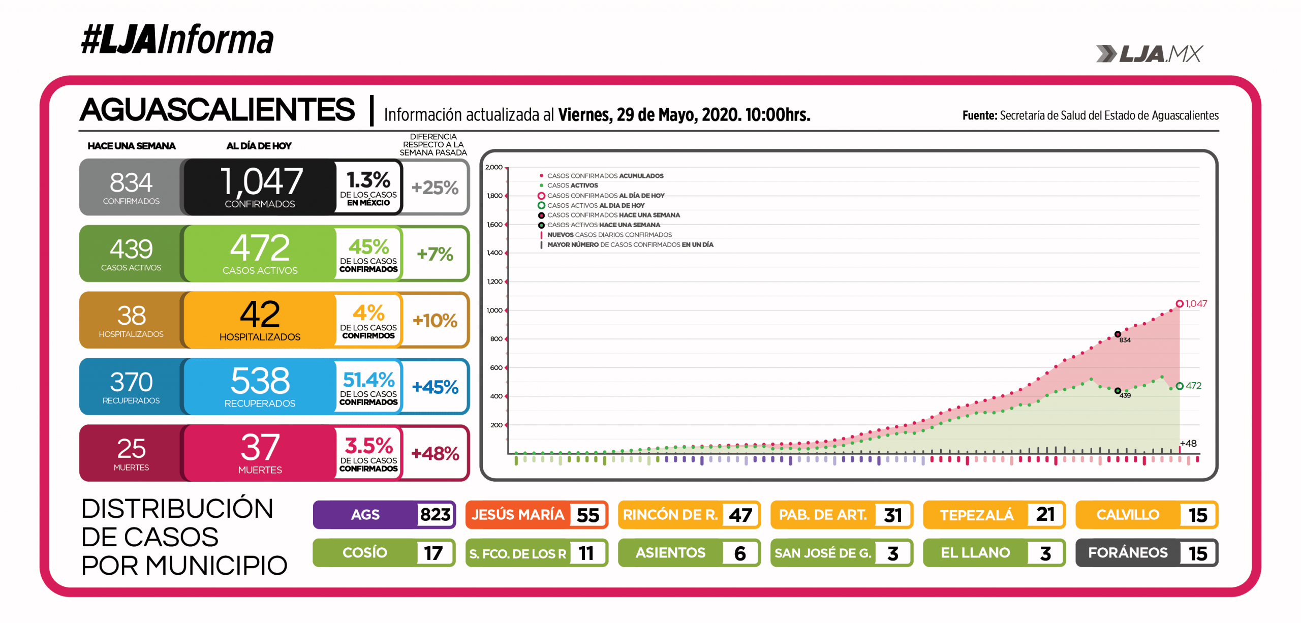 A tres días de terminar la Jornada de Sana Distancia en México, Aguascalientes ha confirmado hoy una nueva cifra máxima de nuevos casos de COVID-19, registrando 48 contagios en las últimas 24 hrs, con lo que a entidad alcanza ya los mil 47 pacientes infectados con Coronavirus SARS-Cov2. Este incremento en el número de contagios se da a escasos 6 días de que en el estado se ha permitido la reapertura de comercios bajo el “visto bueno” de la Dirección de Riesgo Sanitario del ISSEA y un aumento de la movilidad.