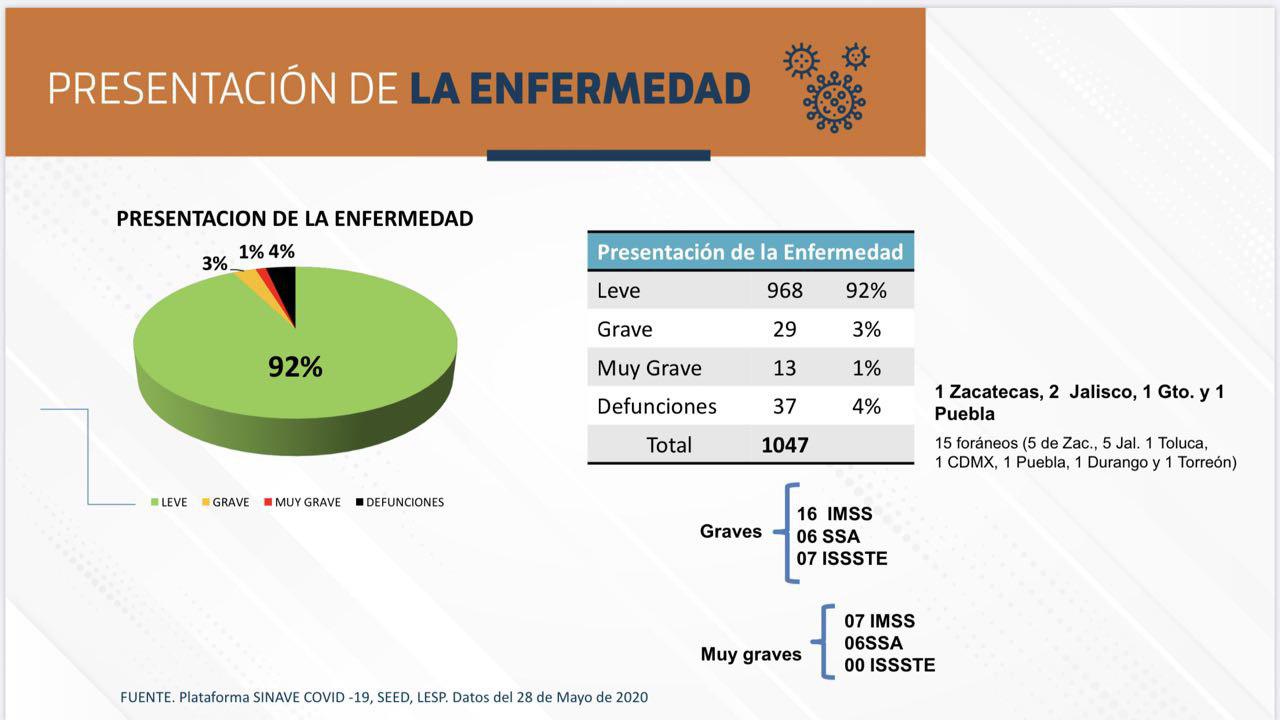 Son 46 los pacientes hospitalizados al día de hoy en Aguascalientes, de acuerdo con reportes de la Secretaría de Salud Estatal, 29 de los casos se encuentran en situación grave, mientras 13 se encuentran en condición crítica (muy grave), siendo atendidos en su mayoría por el Instituto Mexicano del Seguro Social con 23 pacientes, seguido del Hospital Hidalgo con 12 y el ISSSTE con 7.