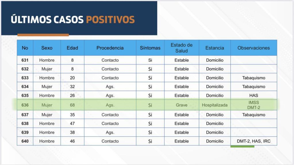 En cuanto a los casos de muertes por COVID-19 en Aguascalientes, la entidad ya ha sumado 9 decesos en lo que va de la semana, igualando así el número de nuevas muertes reportadas la semana pasada. Las dos nuevas defunciones confirmadas el día de hoy corresponden a una mujer de 68 años, derechohabiente del IMSS, que presentaba Diabetes tipo 2, y un hombre de 51 años, originario de Puebla del que no se presenta más información sobre comorbilidades o institución medica tratante.